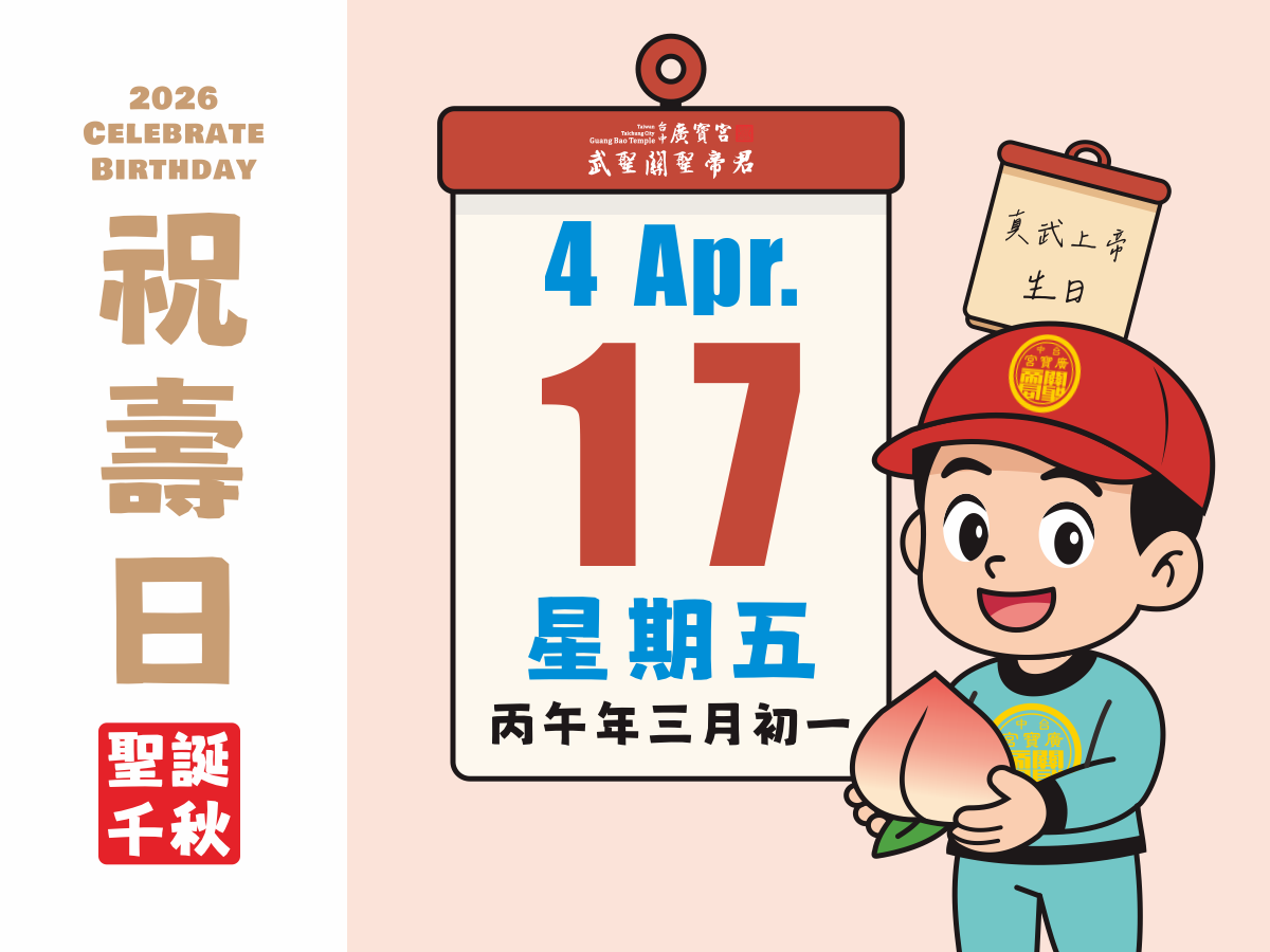 本宮謹訂於農曆三月初一日,恭逢真武上帝聖誕千秋,舉行祝壽團拜儀式,以申虔誠,恭祝聖壽無疆。